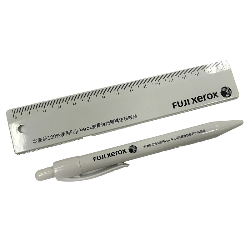 將報廢的印表機、事務機外殼拆解,再生並結合企業贈品巧思,製成了環保文具組。在企業贈禮的同時,也落實了社會責任和循環經濟理念。